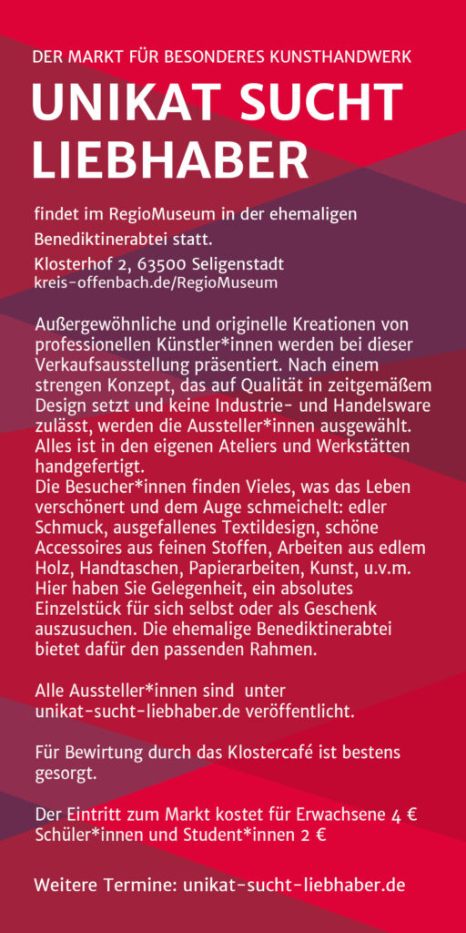 In der ehemaligen Benediktinerabtei in Seligenstadt befindet sich das RegioMuseum. Hier engagiert sich „Unikat sucht Liebhaber“ seit 2018. Auch vorher gab es hier schon einen Markt für Kunsthandwerk. Die Ausstellungsräumlichkeiten befinden sich allesamt im Innenraum.