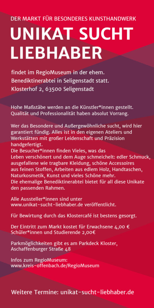 In der ehemaligen Benediktinerabtei in Seligenstadt befindet sich das RegioMuseum. Hier engagiert sich „Unikat sucht Liebhaber“ seit 2018. Auch vorher gab es hier schon einen Markt für Kunsthandwerk. Die Ausstellungsräumlichkeiten befinden sich allesamt im Innenraum.